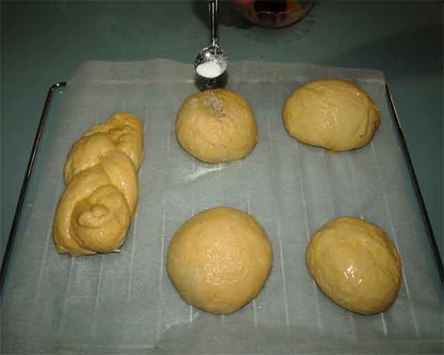 - Vuelve a darle forma, pinta con el huevo y espolvoréalo con azúcar.